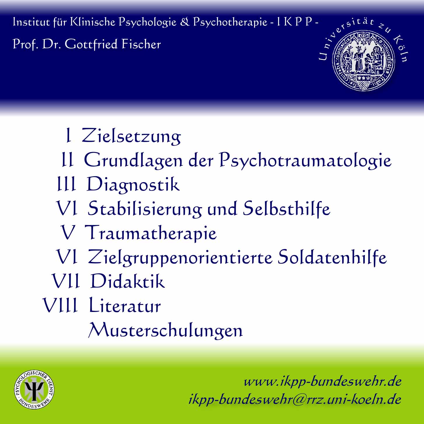Ziel des Projektes "Prävention und Behandlung von Psychotraumen" ist es, den Folgen potentiell traumatischer Erlebnisse im Einsatz vorbeugend zu begegnen. Die Forschungsgruppe bemüht sich um die Erstellung eines differenzierten Schulungs- und Screeningsystems. Dabei wurde ein Screeningsinstrument für eine psychotraumatologische Risikoeinschätzung nach belastenden Ereignissen entwickelt - der Kölner Risiko Index - Bundeswehrversion.